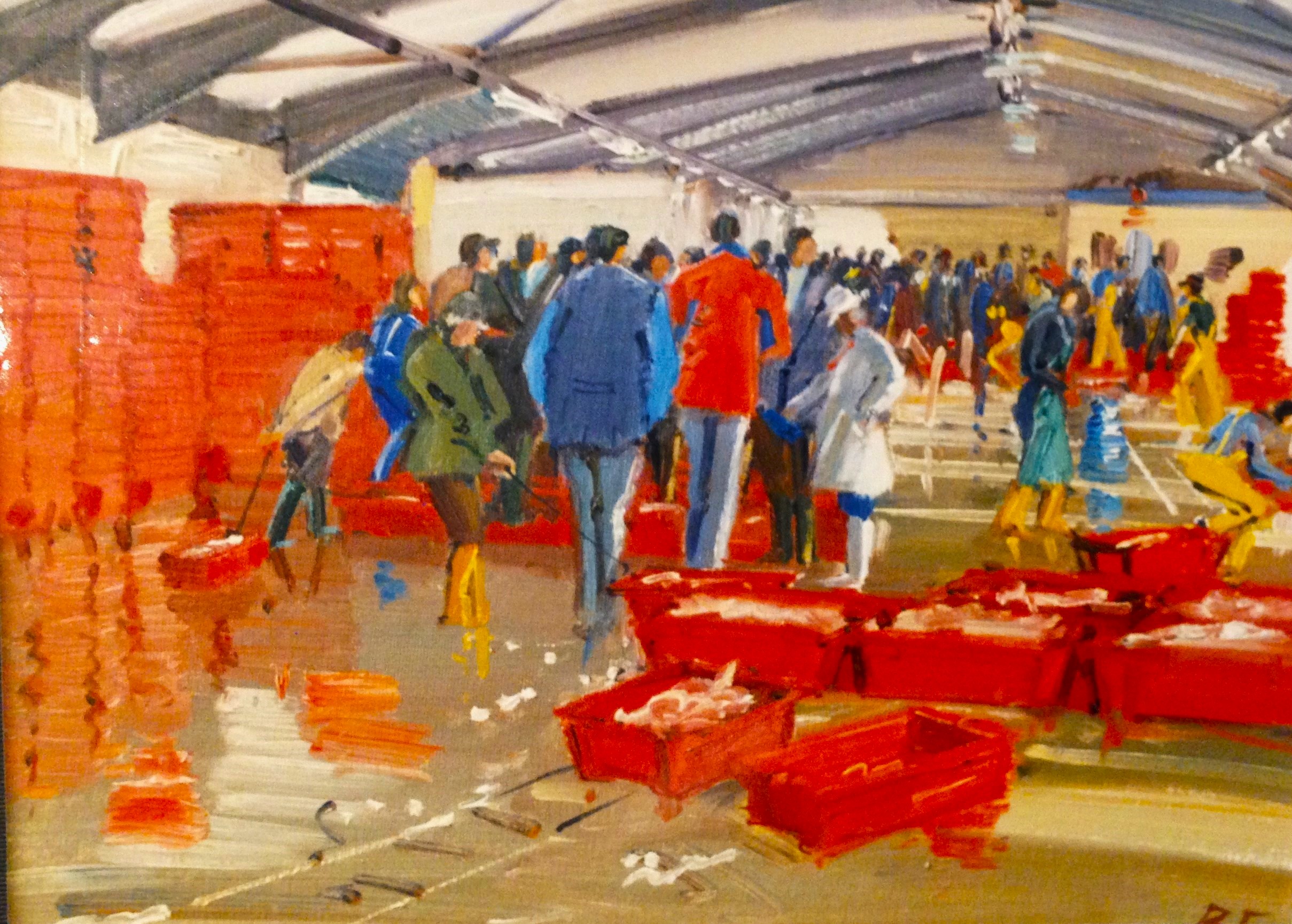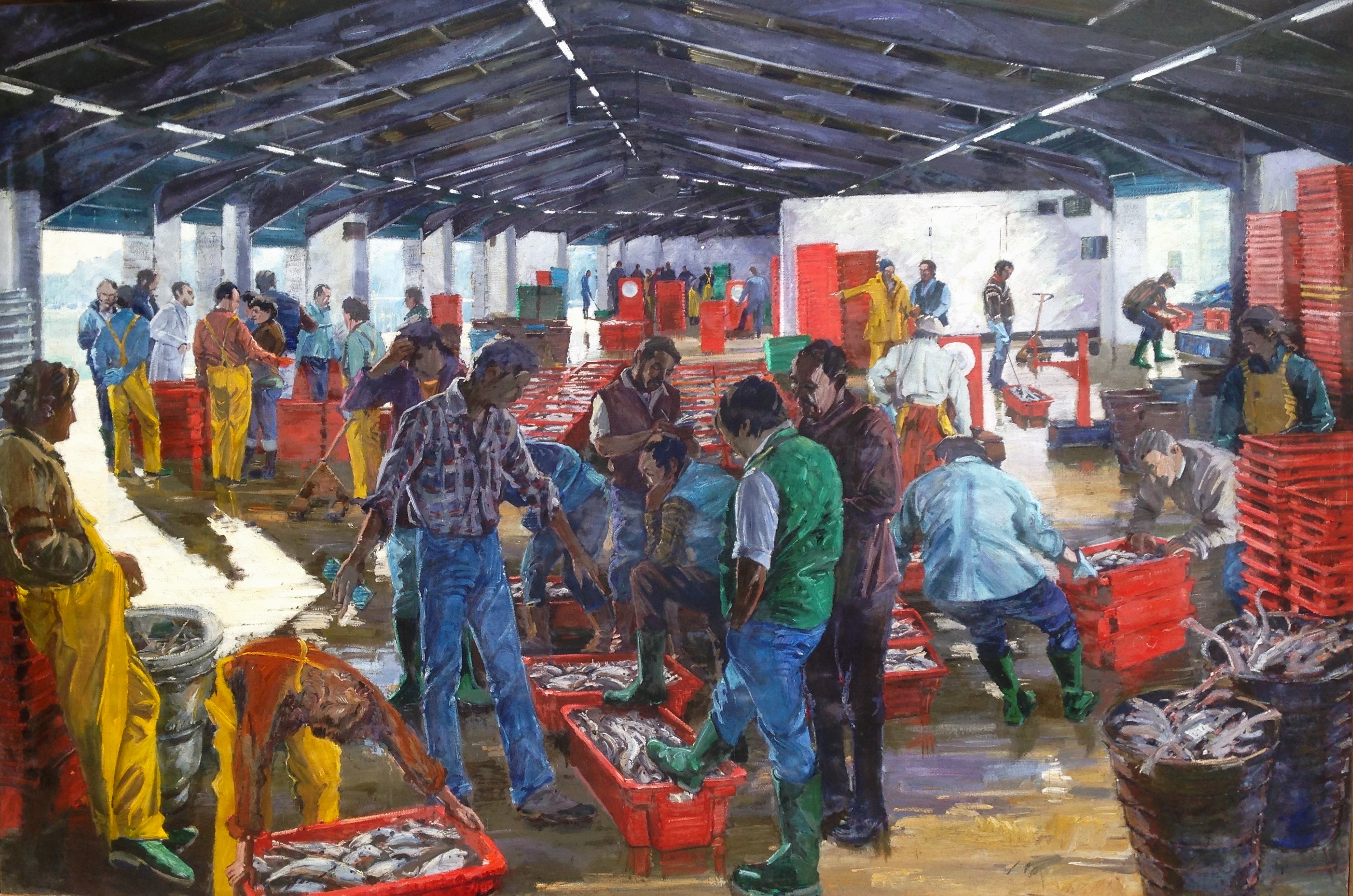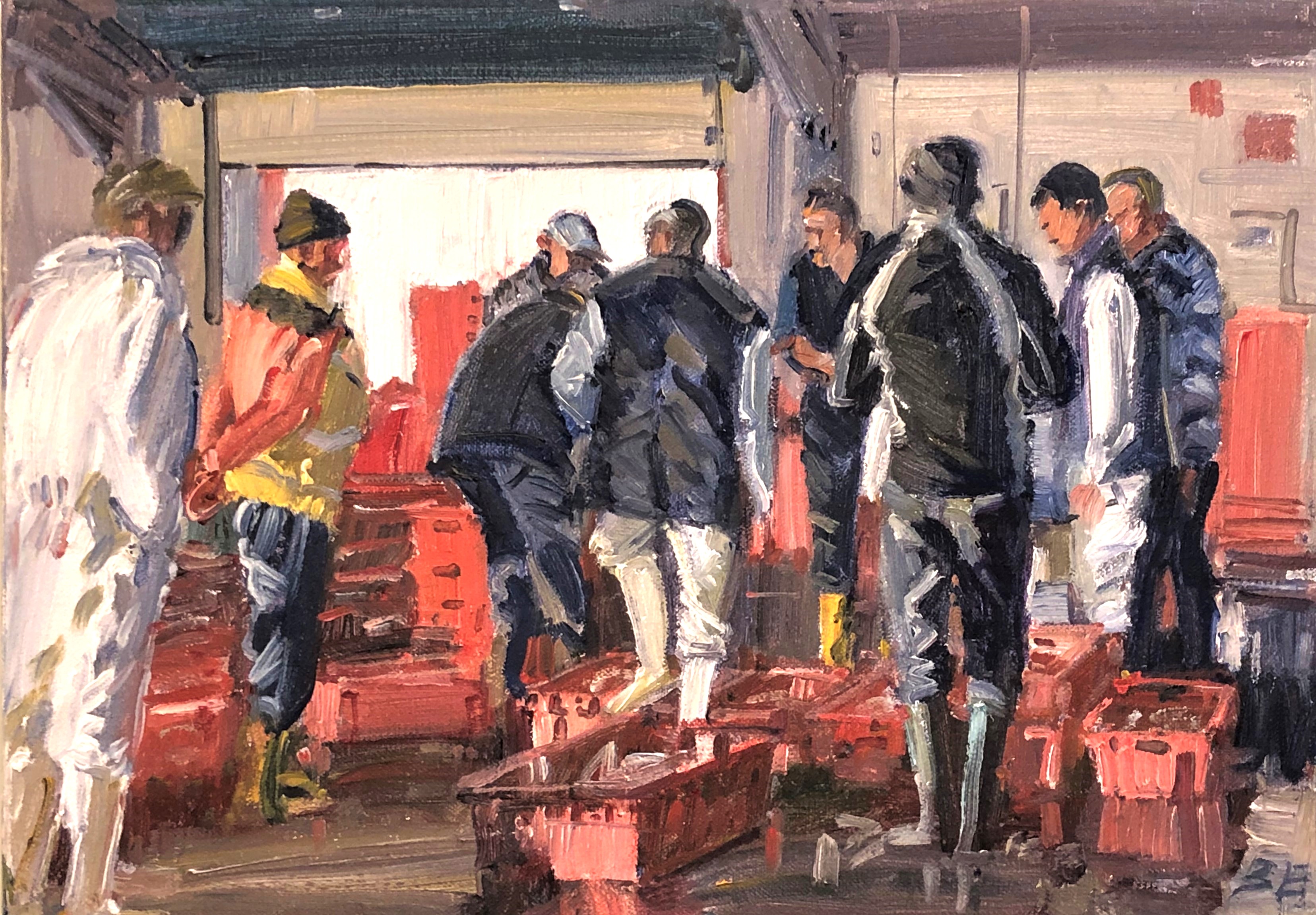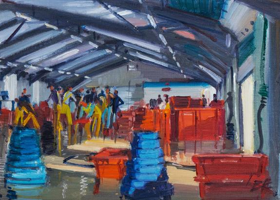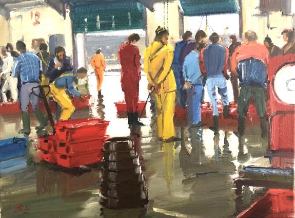 Landing of fish mainly from Stevenson & Sons trawlers 1995. Bernard became very friendly with the fish auction people and enjoyed painting "Cornish Life" - the workers in Cornwall