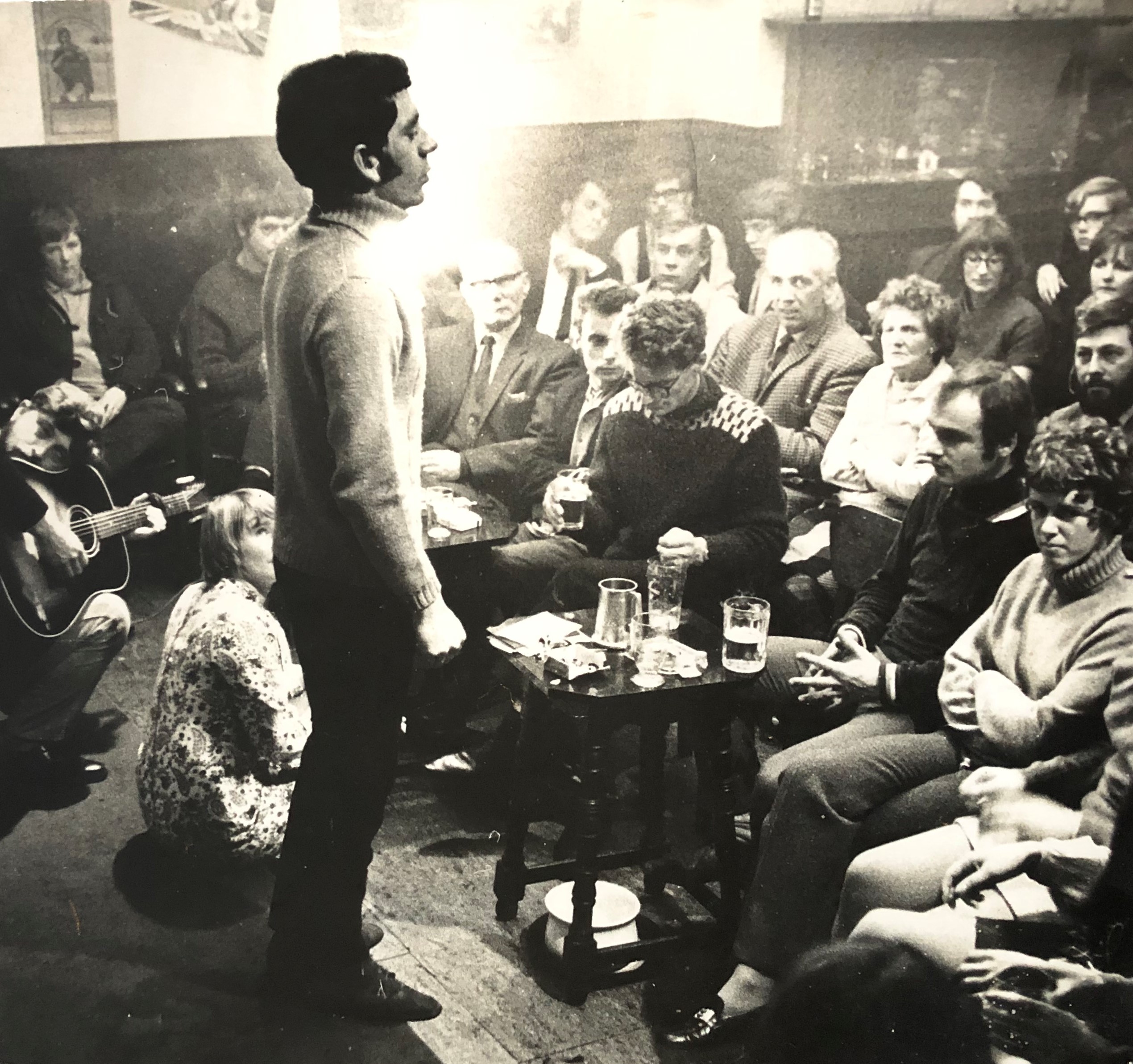 Photo taken circa 1969 by Bernard Evans, of John Finnan - locally well known folk singer and guitarist - in Chester folk club. Audrey Evans is towards the back of the audience with glasses, dark top, dark hair.
